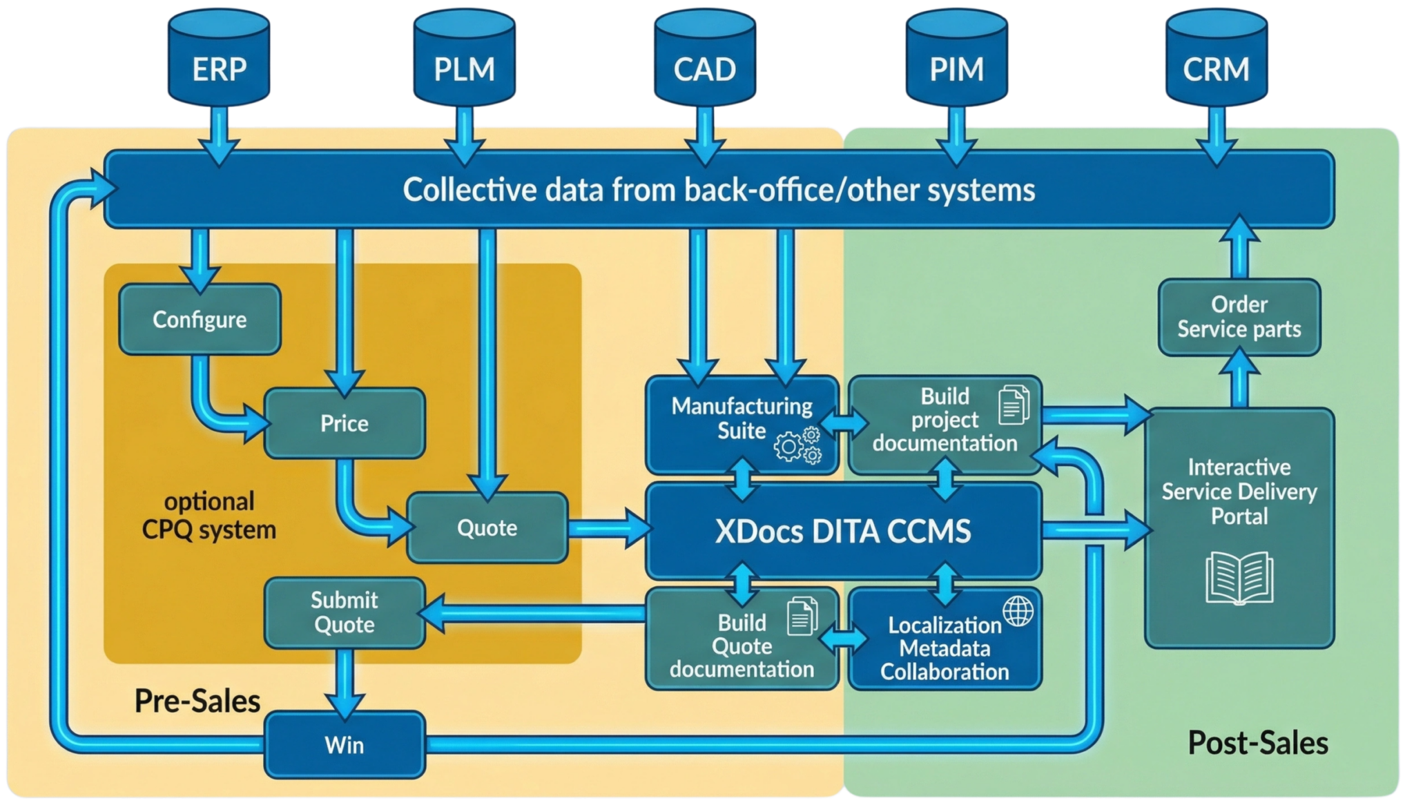 By using XML and DITA, standard ‘boilerplate content’ can be easily created and reused across quotations. This might include product descriptions, functionality matrixes and much more. This content is much easier to curate within a CCMS and can also be easily localized. XDocs DITA CCMS can be incorporated with CPQ systems and generate information to support the quotations automatically based on a particular configuration. It can then publish this information in the required format PDF or online.